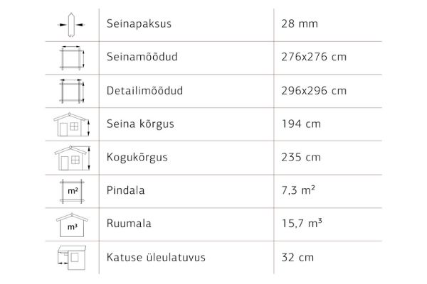Tuuletapiga seinadetailid tagavad niiskuse- ja tuuletõkke, samas kui 28 mm paksused seinad loovad tugeva ja stabiilse karkassi. Klaasitud topeltuks (4 mm klaas) laseb sisse rohkelt loomulikku valgust, liimpuidust ukseraam ja metalliga kaetud lävepakk lisavad vastupidavust. Katus on valmistatud punni ja soonega laudadest, mis on sobilikud erinevate katusekattematerjalide paigaldamiseks.