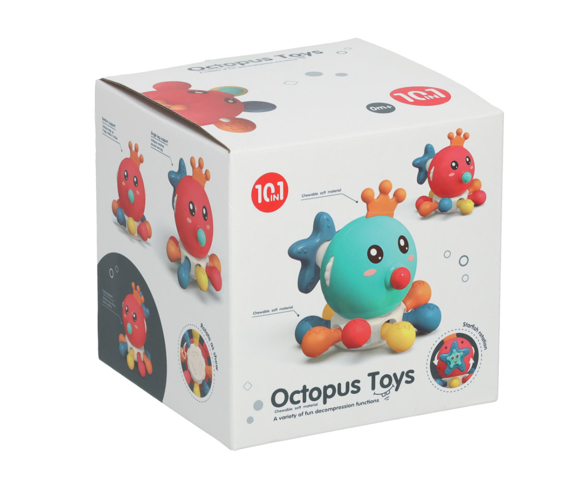 Närimismänguasi kaheksajalg aitab beebidel leevendada hammaste tulekuga seotud ebamugavusi, pakkudes samal ajal sensoorseid stiimuleid ja toetades peenmotoorika arengut. Selle närimismänguasja pehme ja turvaline tekstuur on loodud spetsiaalselt väikestele kätele ja hammastele, võimaldades lapsel avastada ja mängida ohutult. Kaheksajala värviline ja lõbus disain ergutab lapse loovust ning mängu kaudu arenevad olulised oskused, näiteks käe-silma koordinatsioon ja meelte tundlikkus.