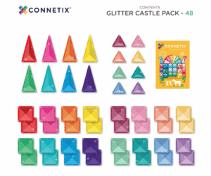 Connetix magnetklotsid Glitter Castle Pack 48-osaline on loodud suurtele unistajatele ja väikestele fantaasiamaailma avastajatele. Kaunid sädelevad magnetklotsid pastelsetes ja erksates vikerkaarevärvides lisavad igale ehitisele võlu ja sära. Komplektis on ruudukujulised, võrdkülgsed ja võrdhaarsed kolmnurgad – kõik kaunistatud mitmevärvilise läike ja glitteriga, mis muudavad iga ehituse tõeliselt võluliseks.