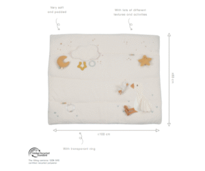 Tegelusmatt peidab endas mitmeid üllatusi – väike ohutu peegel eneseavastamiseks, armsad sildid, hambarõngas ja läbipaistev kõrisev rõngas, mis äratab lapse uudishimu. Lisaks tervitavad beebit pehme haneke ja armas täheke, pakkudes sõprust ja lohutust.
