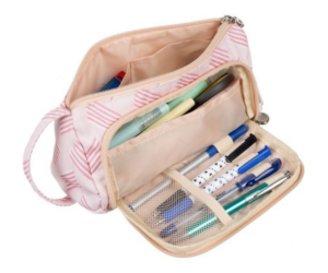 Peamisesse suurde lahtrisse mahuvad kõik vajalikud kooli- ja kontoritarbed – pliiatsid, pastakad, markerid, joonlauad ja käärid. Kaks sisemist taskut sobivad ideaalselt väiksemate esemete hoiustamiseks, nagu kustukummid, teritajad või märkmelehed. Volditav esiklapp eraldab põhisahtlit ja sisaldab väikest võrktaskut, kuhu saab paigutada münte, võtmeid või post-it’i märkmeid. Viis kummiaasa võimaldavad kinnitada enimkasutatavaid kirjutusvahendeid kiireks ja mugavaks ligipääsuks.