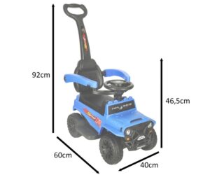 Auto ergonoomiline kuju ja mugav iste tagavad lapsele kindla ja stabiilse istumisasendi. Komplekti kuuluv käepide võimaldab vanemal sõidukit juhtida, kuni laps ise tasakaalu ja jõudu kogub. Tänu auto madalale raskuskeskmele ja tugevatele ratastele püsib sõiduk kindlalt rajal ka keerulisemal maastikul.