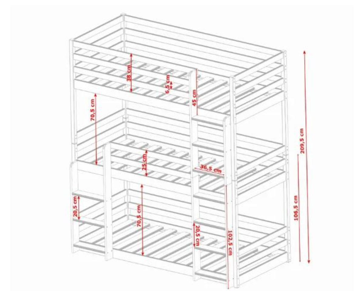 See kolmekordne narivoodi mahutab kolm last ning sobib ideaalselt väikestesse tubadesse, kus elavad õed-vennad. Voodi on varustatud turvaliste kõrgete piiretega, mis takistavad lapsel une ajal voodist kukkumist. Ülemisele korrusele pääseb turvalise redeli abil, mida saab paigaldada nii vasakule kui paremale küljele.