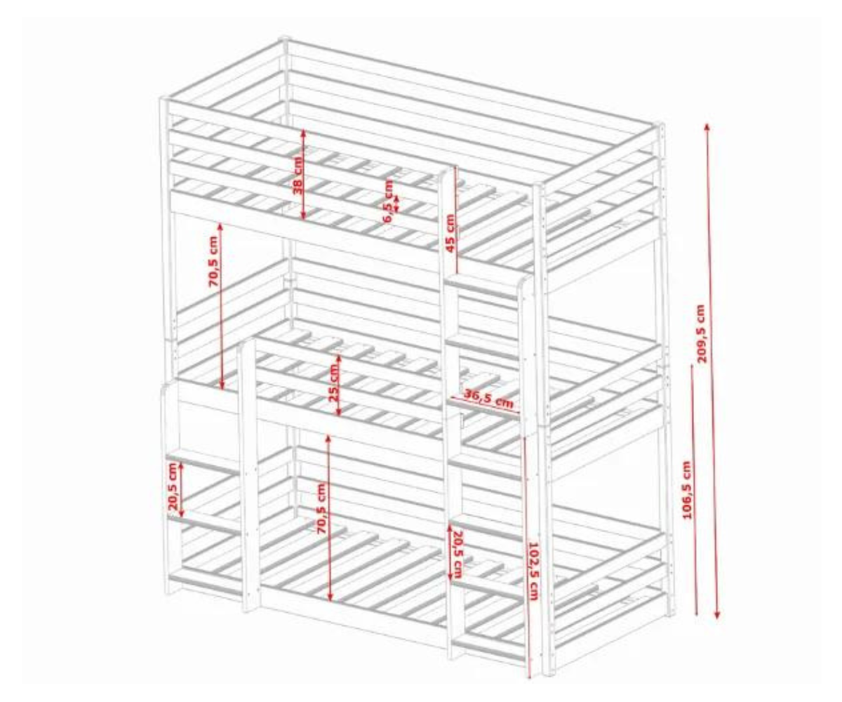 Kolmekohaline narivoodi Ted 80x180cm, valge on ruumisäästlik voodi sobib ideaalselt peredele, kus jagavad tuba kaks või kolm last, jättes samal ajal piisavalt ruumi mängimiseks ja õppimiseks. Voodi sobib lastele alates 1.5 eluaastast kuni teismeeani välja.
