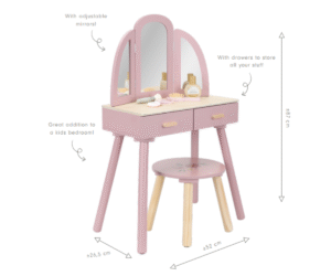 Komplekti kuulub kuus puidust ilutarvikut – peegel, pintsel, huulepulk, küünelakk ja muud armsad esemed, mis muudavad mängu veelgi tõetruumaks. Komplekti täiendab võluv lillemustriga taburet, mis sobib ideaalselt laua juurde.