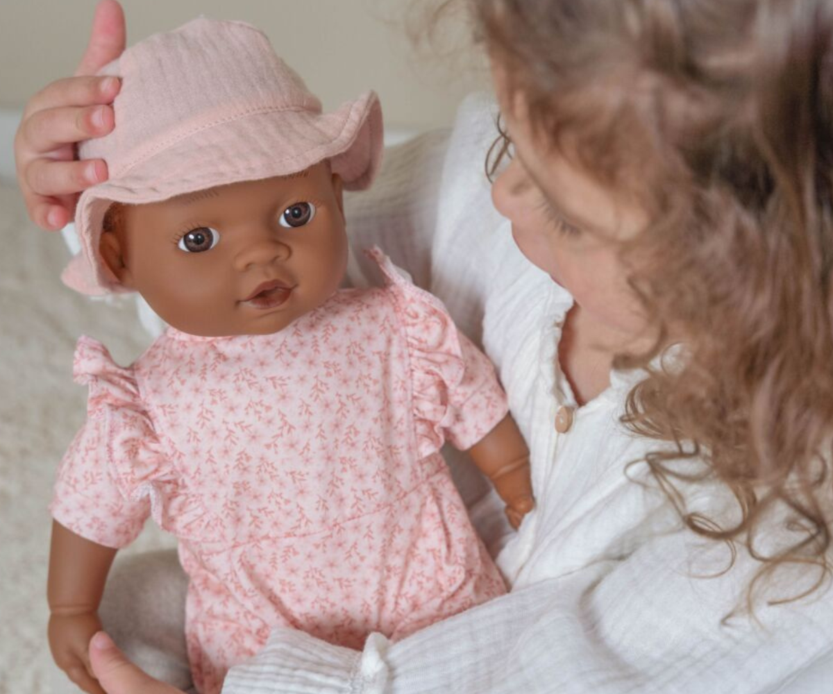 - Roosa päikesemüts – stiilne ja praktiline lisand, mis täiustab nuku riietust ja kaitseb nukku “päikese” eest, muutes väliseiklused veelgi lõbusamaks.