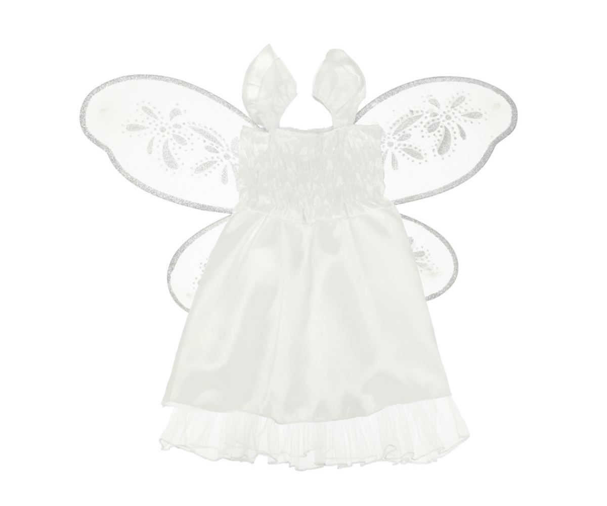 Valge kleit on kaunilt viimistletud, lisades lapsele ingellikku võlu. Tiibade mõõtmed (42 x 67 cm) ja peapael täiendavad kostüümi täiuslikult.