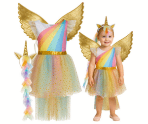 See armas ükssarvikukostüüm toob väikese printsessi päeva palju sära ja mängurõõmu ✨. Kostüüm sobib tüdrukutele pikkusega 110–116 cm (u 4–6 a) ning muudab iga karnevali, sünnipäeva, halloweenipeo või kooli etenduse tõeliselt maagiliseks. Üks komplekt katab kõik peod – lihtne, praktiline ja alati valmis kasutamiseks! 🦄💖