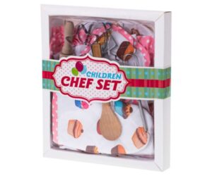- Komplektis vajalikud köögitarvikud – põll, pajakinnas, pajalapp, kokamüts, taignarull, vispel, puulusikas