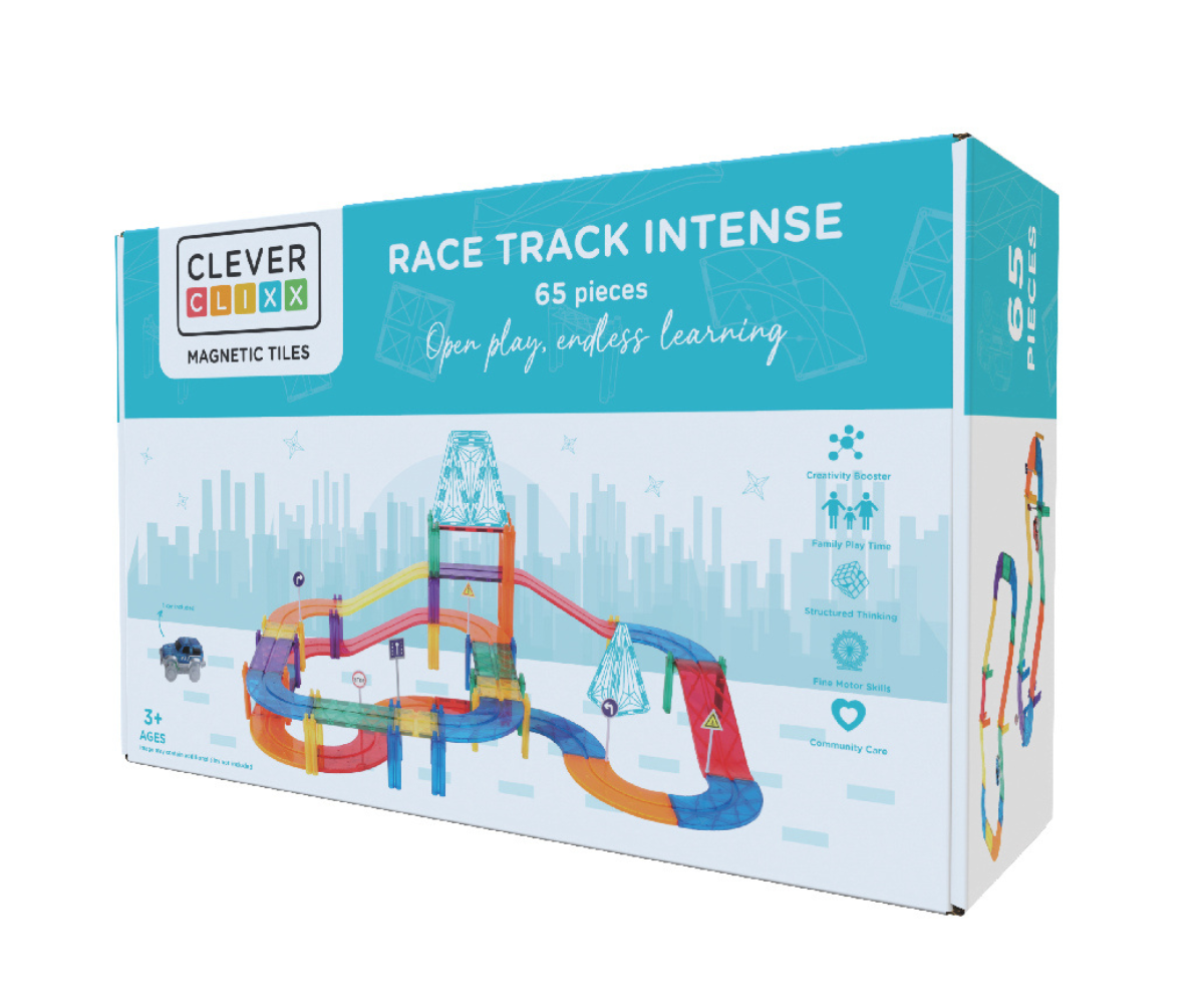 Cleverclixx magnetklotsid Race Track Intense 65-osaline, selle põneva komplekti abil saab sinu laps ehitada kõige lahedamaid mitmetasandilisi võidusõiduradasid. Komplektis on liiklusmärgid, isesõitev auto ja sambad, mis lisavad mängule veelgi rohkem lõbu ja väljakutseid.