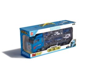 Suur sinine veok, mis võimaldab turvaliselt transportida kiirreageerivaid väikeautosid.