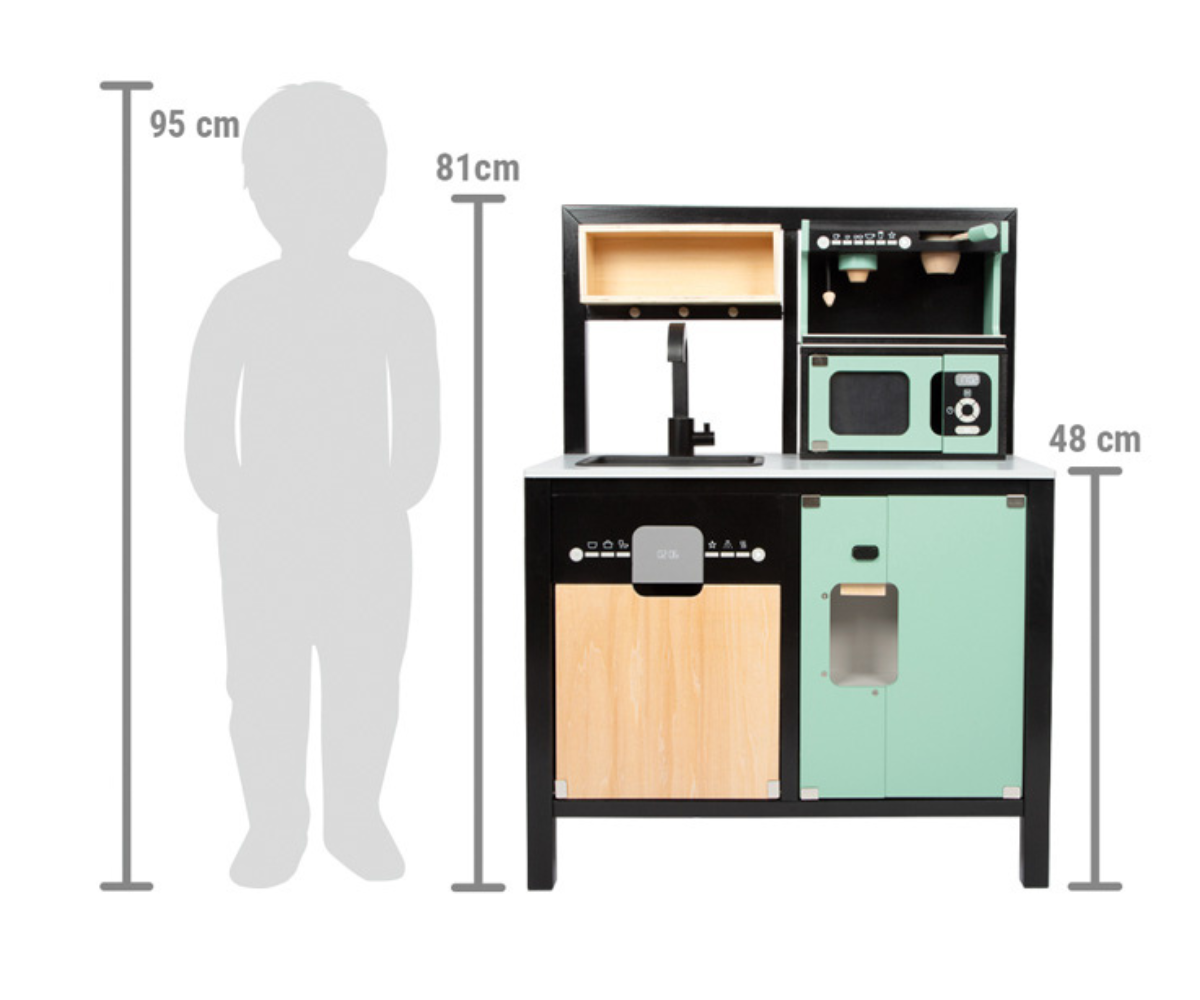 Modernne puidust mänguköök köögisaarega Industrial Small foot on pliit, grill, kraanikauss, ahi, nõudepesumasin, mikrolaineahi, külmkapp koos jääkuubikuautomaadiga ja prügikastide sorteerimissüsteem. Pööratavad nupud klõpsatavate helidega ning realistlikud detailid, nagu kraanid ja köögitarvikud, muudavad mängu tõeliselt kaasahaaravaks. Lapsed saavad avastada kokanduse põnevat maailma, arendades samal ajal oma kujutlusvõimet ja peenmotoorikat.