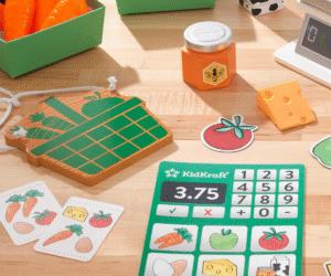 Komplekt sisaldab neli väikest kriiditahvlist hinnasilti, neli puuviljakorvi, rippuvat turusilti ning palju muud, millega laps saab end turumüüja rolli asetada. 🎪🧺 Lisaks toidukaupadele ja aksessuaaridele kuulub komplekti ka kassasahtli sisend, mis muudab mängu veelgi realistlikumaks.