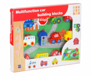 Komplekt sisaldab värvilisi puidust klotse autode ja sõidukite kujul, nööri ja mängutahvlit. Laps saab klotse nöörile ajada või asetada need tahvlile, luues omaenda liikluslinna. Mängides õpib laps tundma kujundeid, värve ja mustreid ning arendab käe-silma koordinatsiooni.