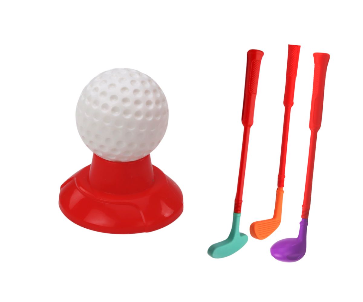 Komplekti kuulub kolm erineva otsikuga keppi, mis võimaldab mängu mitmekesistada ja kohandada lapse oskustele ja eelistustele. Viis palli annavad mitu katset ja võimaluse tehnikat parandada ning kaks auku kahe lipuga loovad realistliku mänguvälja.