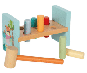 Lapsed saavad värvilisi puidust silindreid kummist avade kaudu haamriga läbi lüüa, mis arendab peenmotoorikat, käe-silma koordinatsiooni ja keskendumisvõimet. 🪵 Kui kõik silindrid on läbi löödud, saab pingi lihtsalt ümber keerata ja mäng algab uuesti – lõputu rõõm väikestele avastajatele!