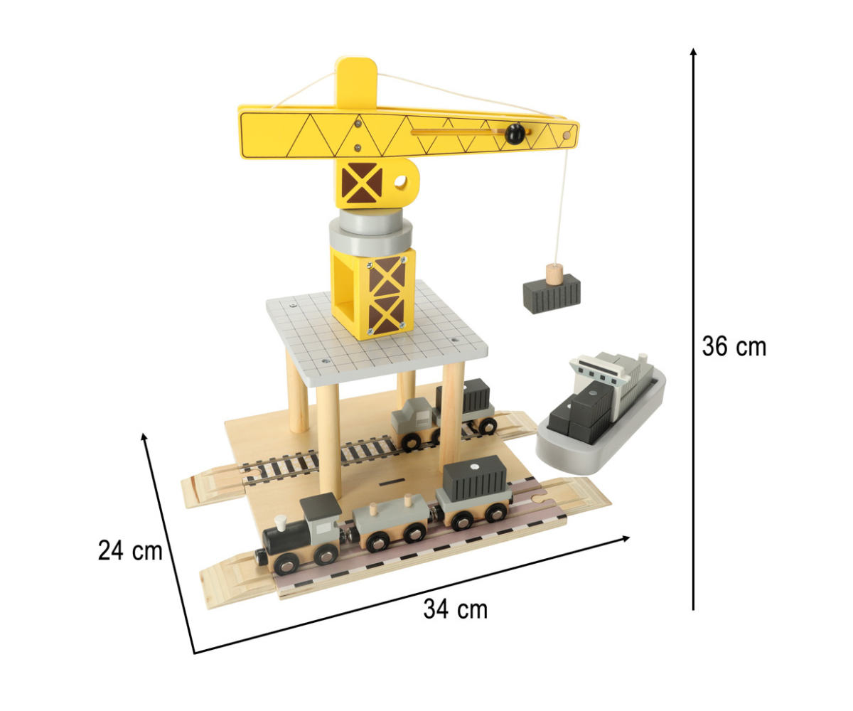 Puidust kraana ja meresadam – laev, konteinerid ja autod on ideaalne mänguasi, mis viib lapsed põnevasse logistikamaailma. Lapsed saavad selle logistika mängukomplektiga ehitada oma sadama ja tegeleda konteinerite laadimise ning transpordiga. Komplekt sisaldab kõike vajalikku – kraana, laeva, rongi ja 12 konteinerit, mis annavad lastele võimaluse tundideks loovaks ja harivaks mänguks. Magnetiga kraana ja köis võimaldavad hõlpsasti tõsta konteinereid laevalt rongivagunitele, lisades mängule realistlikkust.