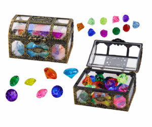 Komplektis on 17 erinevas suuruses ja kujuga värvilist kristalli, mida lapsed saavad kasutada aardejahtides, maagilistes rollimängudes või lihtsalt koguda ja hoida omaenda „varakambris“. Aardekirst on valmistatud kergest, kuid vastupidavast plastist, mis teeb selle ideaalseks nii toas mängimiseks kui ka õue kaasa võtmiseks.