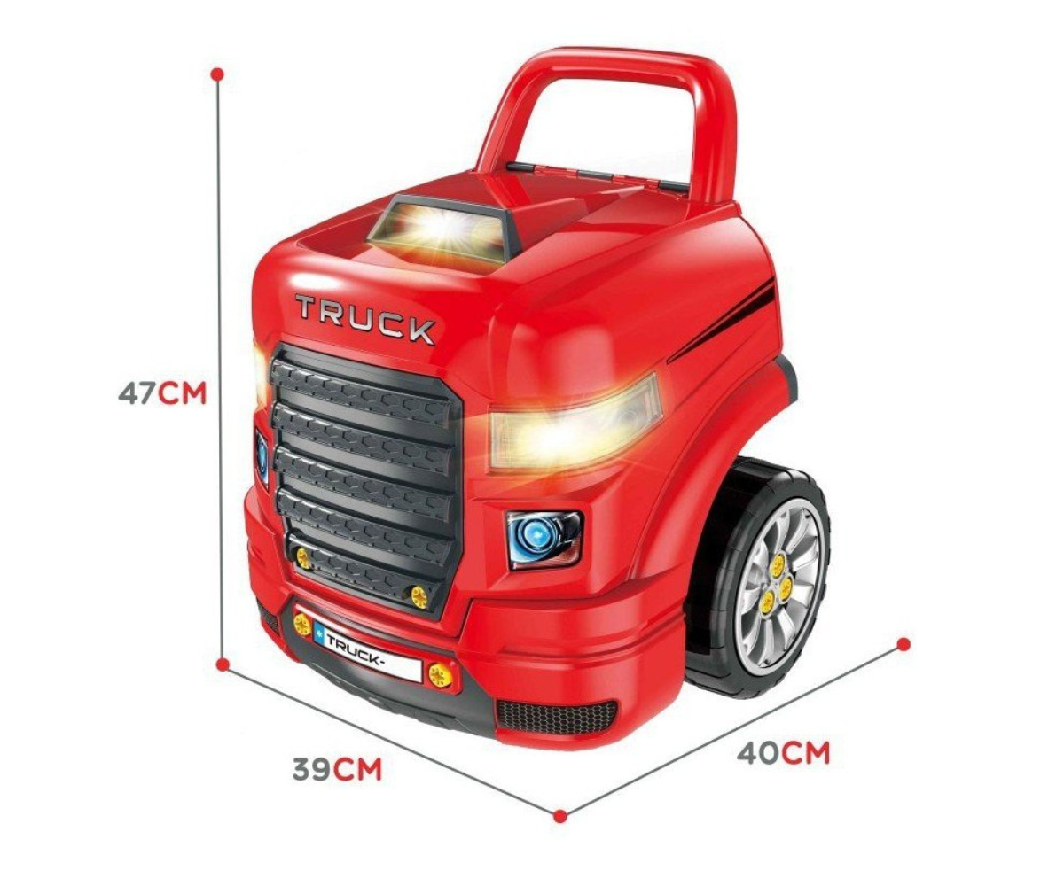 Komplekti kuuluv veoauto on varustatud avatava kapotiga, mille all saab laps kontrollida õlitaset või vahetada süüteküünlaid. Lisaks on veoautol valgus- ja heliefektid, mis muudavad mängu realistlikuks. Laps saab nautida rooli koos signaaliga, käivitusnuppu ja ohutulede funktsiooni. Kruvide ja tööriistade abil saab kinnitada detaile nagu rattad, ilukilbid ja mootori osad, mis arendavad lapse praktilisi oskusi.