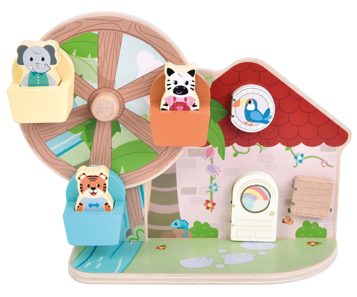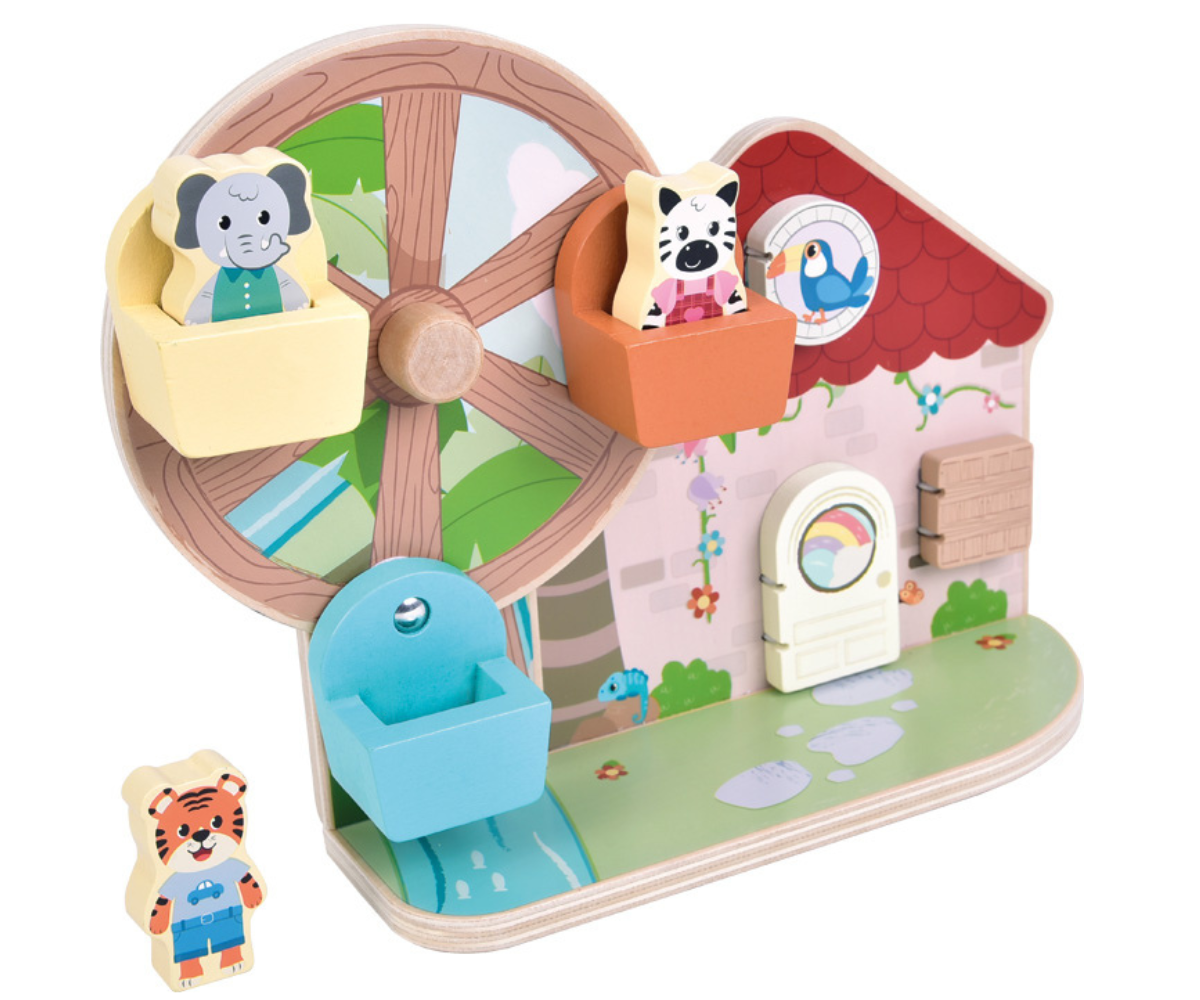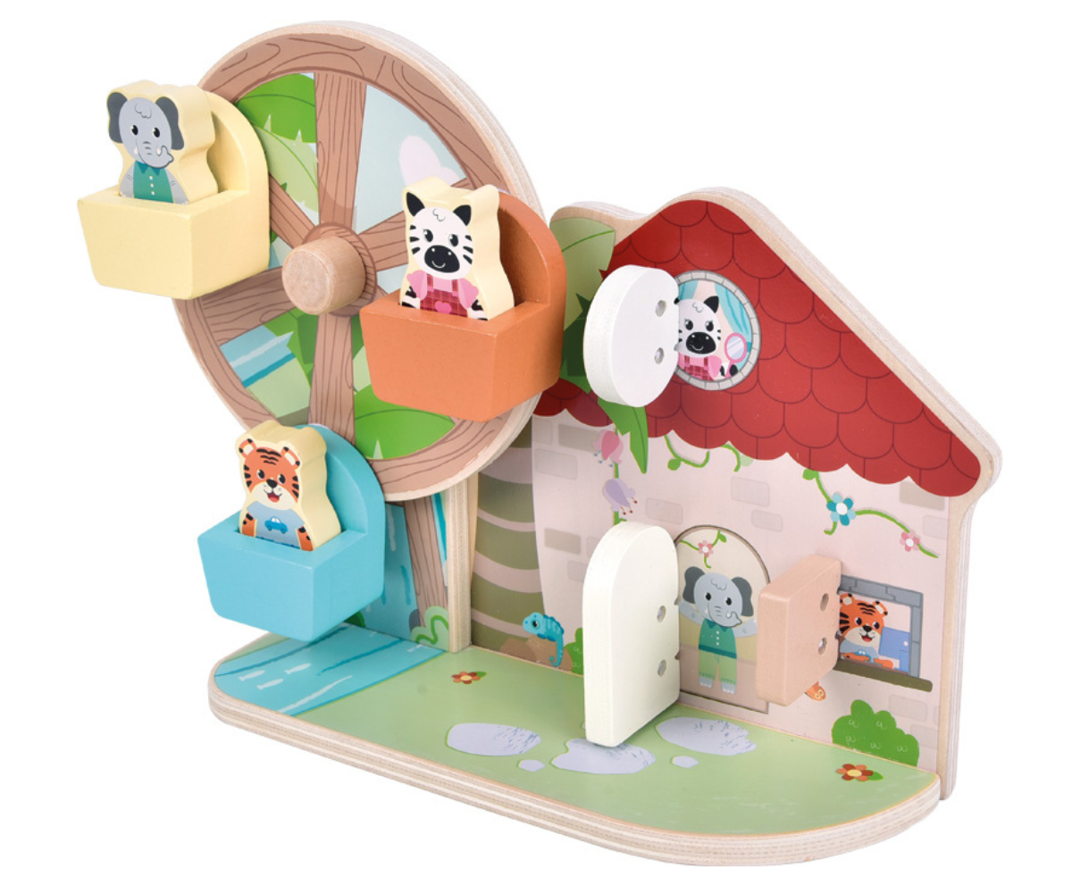 Kolm armsat loomakest – tiiger, sebra ja elevant – sõidavad rõõmsalt vaateratta gondlites. Keerates mängu tagaküljel olevat vändamehhanismi, paneb laps ratta liikuma, arendades samal ajal peenmotoorikat, käe-silma koordinatsiooni ja sihipärast haaramist. 🐘🦓🐅