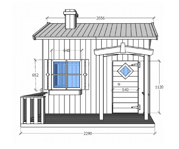 Mängumaja mõõdud väljast: 229 x 257 cm, pindala 3,6m2 + terrass 2,3m2