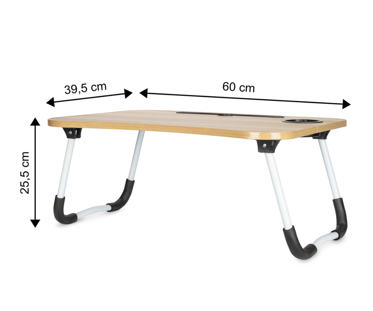 Sülearvutilaud on varustatud mugava süvendiga, kuhu saad asetada oma tahvelarvuti või telefoni, samal ajal kui lauaplaadi serv aitab vältida esemete maha libisemist. Lisaks on olemas tassiava, mis muudab kohvi või tee nautimise töökohustuste kõrvalt veelgi lihtsamaks. See kokkupandav laud on ideaalne ka teisteks tegevusteks nagu joonistamine, kodutööde tegemine või isegi hommikusöögi voodisse serveerimine.